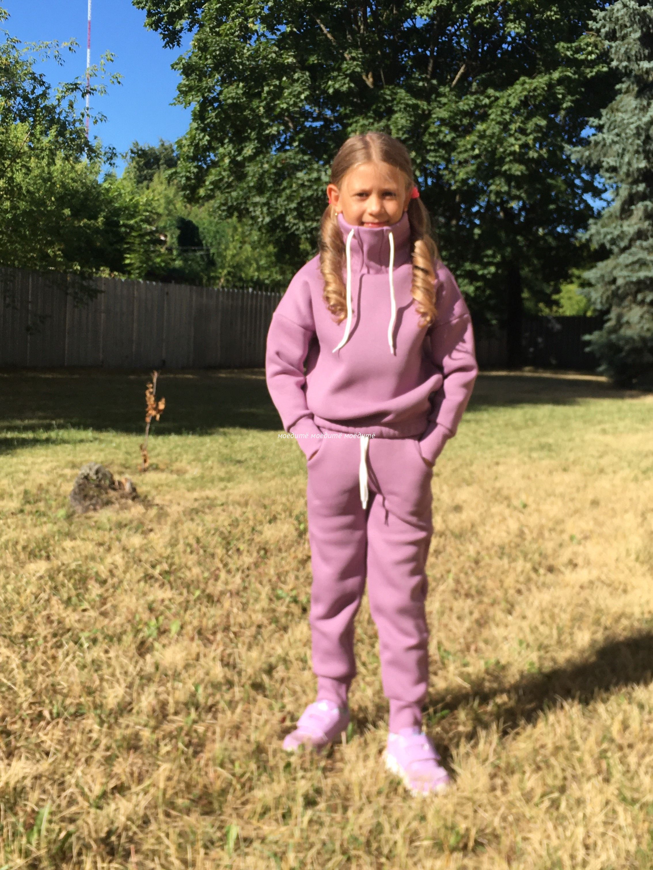 Костюм выполнен из футера 3-хнитки с начёсом. Состоит из свитшота и брюк. Брюки сверху на широкой резинке и со шнурком, снизу на манжете с отворотом. Свитшот с воротником-стойкой, украшен шнурком, снизу вставлена резинка, рукава на манжетах с отворотом.